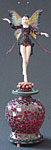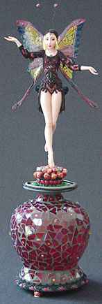 colors. She stands on a stylized flower on top of a glass mosaic base.